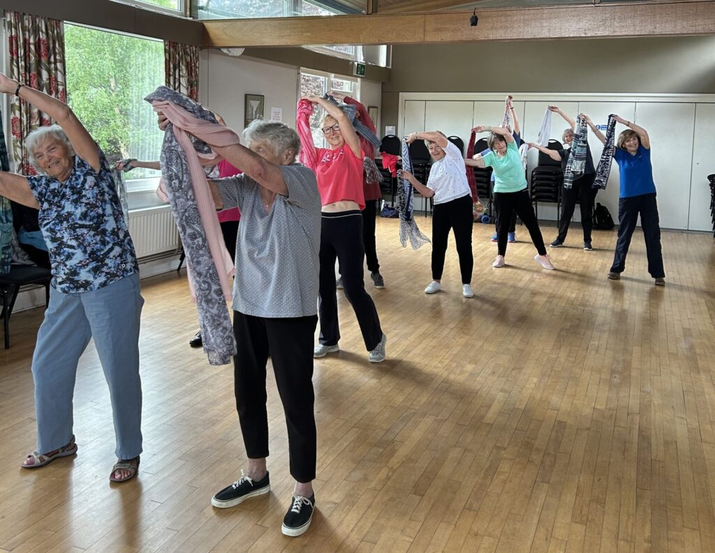 For those of us who enjoy the buzz of jigging around to lively music. We get together to enjoy simple exercises and dance, hoping (!) to keep our muscles, joints, cardio-vascular system, and memory in reasonable working order, helped by good music and a lot of laughter.